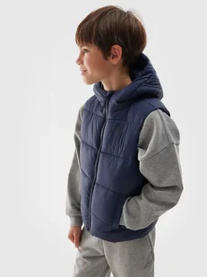 Po bokach znajdują się 2 kieszenie otwarte. Kamizelka puchowa chłopięca jest zapinana na jednokierunkowy zamek główny z wewnętrzną plisą przeciwwiatrową, która ogranicza przenikanie chłodu do wnętrza kurtki. Dół z elastyczną gumą. Krótki bezrękawnik pikowany dla chłopaka - CECHY: krój: regular, który wygodnie dopasowuje się do sylwetki zakres rozmiarów: