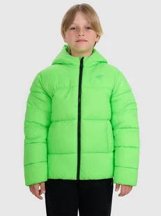 Łatwo się składa i przechowuje, co czyni ją wygodnym i praktycznym rozwiązaniem na różne warunki pogodowe. Kurtka ma klasyczne poziome pikowanie, które składa się z równoległych pasów biegnących w poprzek kurtki. Taki rodzaj pikowania zapewnia dobrą izolację termiczną i odpowiednią kompresyjność kurtki. Posiada krój regular, który wygodnie dopasowuje się do sylwetki oraz standardową długość sięgającą do linii bioder. Kurtka puchowa pikowana chłopięca z wypełnieniem w postaci ociepliny syntetycznej Kurtka puchowa 4F chłopięca z ociepliną poliestrową, którą odpowiednio rozmieszczono w pikowanych panelach kurtki, zapewni optymalny komfort cieplny bez obciążenia.