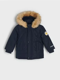 Sinsay - Ciepła kurtka z kapturem - granatowy - sztuczne futro wokół kaptura - kaptur jest nie odpinany,zapinana na zamek i zatrzaski,2 przednie kieszenie z zakładką,wykończony polarową podszewką,rękawy z elastycznym ściągaczem od wewnątrz,odblaskowe detale na rękawach