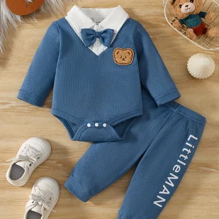 TEMU 2 Sztuki Chłopców Jesienny Wafelowy Niedźwiedź Z Nadrukiem Dwuczęściowy Rękaw Długowy + Boczna Casual Winter Słodka Odzież Sportowa, Idealna Na