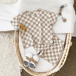 TEMU 2 szt./Zestaw Ubrania dla Chłopca Stylowy Kratowany Miękki i Wygodny T-shirt z Krótkim Rękawem + Uniwersalne Modne Szorty na , Idealny Prezent