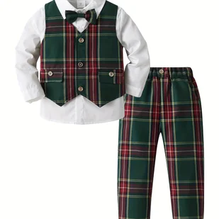 TEMU Chłopięca odzież na Boże Narodzenie dla 1-rocznych, biała koszula, zielona kamizelka w kratę, spodnie, muszka, wieloczęściowy garnitur, impreza