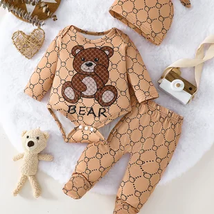 TEMU dla niemowlaka: pajacyk w paski z motywem misia + długie spodnie + czapeczka, idealny na wiosnę i jesień, doskonały do raczkowania i wyjść, na