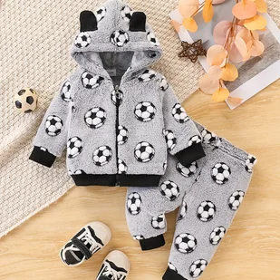 TEMU Jesienno-Zimowa Gruba Pluszowa Odzież dla Noworodków, Uroczy z Kapturem i Długim Rękawem w Wzór Piłkarski + Spodenki z Motywem Futbolowym 2