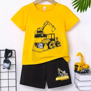 TEMU Kolekcja letnia dla chłopcików z okrągłym dekoltem, nadrukiem z kreskówką, krótkim rękawem, górą i spodnimi szortami, zaprojektowanym swobodny