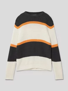 Sweter z dzianiany dziecięcy TOM TAILOR;Mieszanka bawełny;Prosty krój;Blokowe pasy;Okrągły dekolt;Detal z logo;Gruby ścieg;Prążkowane wykończenia;Długość tyłu w rozmiarze 140: 57 cm;Długość rękawa w rozmiarze 140: 55 cm