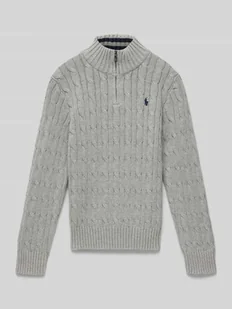 Sweter z dzianiny dziecięcy Polo Ralph Lauren Teens;Czysta bawełna;Krój regular fit;Ścieg warkoczowy;Wyhaftowane logo;Stójka;Zamek błyskawiczny;Długość tyłu w rozmiarze 140: 52 cm;Długość rękawa w rozmiarze 140: 50 cm
