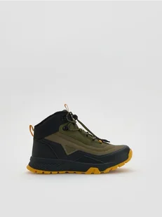 Botki o prostym fasonie, wykonane z łączonych materiałów.
