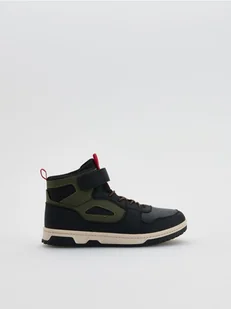 Buty o prostym fasonie, wykonane z łączonych materiałów.