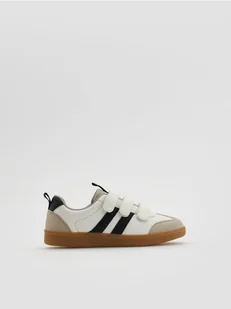 Trampki o prostym fasonie, wykonane z łączonych materiałów.