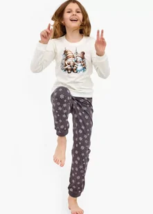 Piżama dziewczęca z miękkiej, naturalnej bawełny. Koszulka z długim rękawem ozdobiona świątecznym nadrukiem. Do kompletu długie spodnie z zimowym motywem. Dekolt, mankiety, dół koszulki i nogawki wykończone ściągaczem. Skład: 100% bawełna.