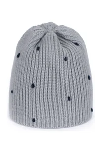 Dziecięca czapka ozdobiona wyszywanymi groszkami.