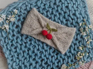 Opaska z wisienką dla dziewczynki. Delikatna wiosenna opaska wykonana ręcznie z połączenia dwóch włóczek, bawełna z merynosem oraz moher (merino. baby alpaka, jak i jedwab). Wełna z której powstała jest mules ...