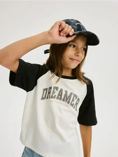 Czapka z daszkiem z haftem, wykonana z bawełnianej tkaniny.