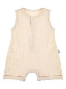 Wyprodukowano w Polsce Muślinowy rampers dla chłopca w kolorze beżowym, uszyty z przewiewnej tkaniny. Jego skład to 100% bawełny. Fason luźny, bardzo wygodny. Przód zdobi zapięcie typu polo oraz odwijane nogawki Zapinany na wygodne bezniklowe napy na przodzie i kroku. Ułatwi to przebieranie maluszka.