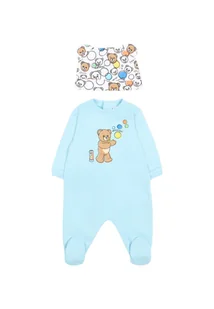 Set tutina Moschino Kids composto da tutina celeste con piedini integrati e cappellino coordinato. Sul davanti spicca il teddy bear iconico che gioca con bolle colorate, accompagnato dal logo Moschino a contrasto. Il cappellino bianco presenta all-over print di orsetti e palloncini multicolor che riprende il tema grafico della tutina. Collo tondo e polsini a costine morbide, insieme alla pratica chiusura posteriore con bottoni automatici, creano un insieme confortevole e visivamente armonico.
