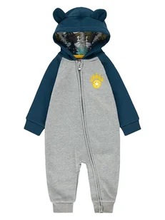 Kombinezon w kolorze szaro-niebieskim - kaptur: tak - zapięcie: suwak - osłona podbródka: tak - ściągacz: zakończenia rękawów, zakończenia nogawek - detale: aplikacje - wzór: colour blocking - nadruk: logo