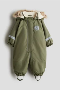 Watowany kombinezon zimowy z hydrofobowego materiału funkcjonalnego z odblaskowymi detalami. Odpinany kaptur z podszewką z misia i z puszystym brzegiem. Stójka, zapięcie na suwak z osłoną przed otarciem i listwą ochronną. Elastyczny tył talii oraz elastyczne brzegi rękawów i nogawek. Wzmacniany odpinany pasek pod stopą.