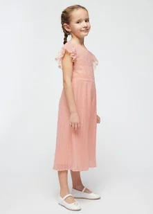 Kombinezon plisowany z nogawkami 7/8 dla dziewczynki. Śliczny kombinezon z krepy z tyłem w kształcie litery V oraz plisowanym dołem. Zapięcie z tyłu na ukryty zamek. Model z haftami. Skład: 100% Poliester