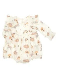 Rampers dla dziewczynki z długim rękawem w kolorze kremowym w motyw jednorożców, chmurek i tęcz. Rękawki zakończone są falbanką. Dolna część rampersa została zmarszczona na linii talii oraz w nogawkach bezuciskową gumeczką. Całość dopełnią dwie ozdobne falbany na przodzie. Zapinany na bezniklowe napy na plecach w łezkę i w kroku, co ułatwia przewijanie maluszka.