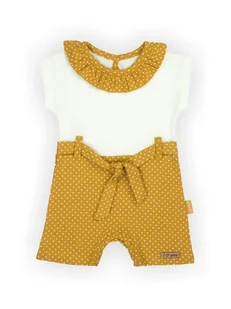 Wyprodukowano w Polsce Doskonały w ciepłe dni, rampers dla dziewczynki wykonany z musztardowej oraz kremowej kolorystyki. Posiada krótkie rękawki i nogawki. Ubranko zdobi sznureczek w pasie oraz kołnierzyk przy szyji, a wygodne napy na ramieniu i w kroku ułatwiają przewijanie maluszka. Uszyte ze 100% bawełny posiadającej certyfikat Oeko-Tex Standard 100 Tekstylia godne zaufania.