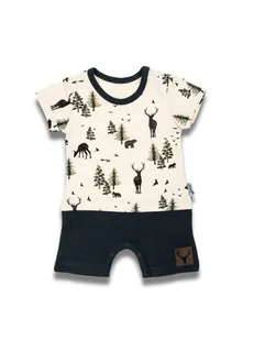 Wyprodukowano w Polsce Doskonały w ciepłe dni, rampers, posiada krótkie rękawki i nogawki. Ubranko powstało z połączenia bluzki z drukowanego materiału w wzór leśny przedstawiający zwierzęta: niedźwiedź, jeleń, sarna, ptaki pośród drzew i spodenek w kolorze grafitowym . Posiada wygodne bezniklowe napy na ramieniu i w kroku ułatwiające przewijanie maluszka.