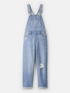 Ogrodniczki w kolorze błękitnym - czysta bawełna - szelki: z przednim panelem i regulacją - kieszenie: wpuszczane, tylne, na piersi - szlufki na pasek: tak - krój: prosty - przetarcia: tak