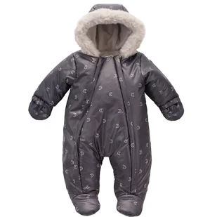 Zimowy, bardzo ciepły kombinezon niemowlęcy w małe księżyce na grafitowym tle, stworzy piękną i niepowtarzalną aranżację wózka lub fotelika samochodowego. Jest miękki, wygodny, a jednocześnie bardzo lekki. Wierzchnia warstwa kombinezonu to wysokiej jakości 100% poliester, odporny na wiatr i zmoczenie. Podszewka to miłe w dotyku szare, sztuczne futerko imitujące futro lamy, które zapewni maluszkowi przyjemne uczucie miękkości. Całości dopełnia świetnie izolujące wypełnienie, które sprawia, że dziecku będzie ciepło nawet w czasie bardzo mroźnych spacerów.