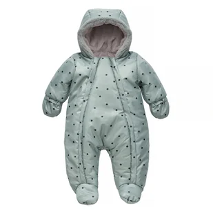 Miętowy kombinezon Winter 2022 ozdobiony kropeczkami. Wierzchnia warstwa kombinezonu to wysokiej jakości 100% poliester, odporny na wiatr i zmoczenie. Podszewka to miłe w dotyku, szare, sztuczne futerko, imitujące futro lamy, które zapewni maluszkowi przyjemne uczucie miękkości. Całości dopełnia świetnie izolujące wypełnienie, które sprawia, że dziecku będzie ciepło nawet w czasie bardzo mroźnych spacerów. Rękawy podszyliśmy od wewnątrz śliskim materiałem.