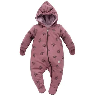 Trzywarstwowy kombinezon dla małej dziewczynki, zapewni ciepło podczas spacerów jednocześnie będąc świetną stylizacją. Wierzchnia warstwa uszyta jest z miękkiej dzianiny bawełnianej w kolorze głębokiego, ciepłego fioletu, z nadrukiem kwiatowym. Podszewka kombinezonu to mięciutka dzianina w odcieniu liliowym. Pomiędzy bawełnianymi warstwami zastosowane jest wypełnienie, które sprawia, że kombinezon zatrzymuje ciepło. Rękawy wykończono ściągaczem i wywijanymi rękawiczkami-łapkami, które doskonale chronią dłonie maluszka przed chłodem.