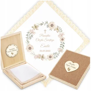 Staramy się szukać nowych pomysłów, tworzyć coś niepowtarzalnego. Zakładamy, że nasze upominki przeznaczone są na specjalne okazje, dla szczególnych osób. Cieszymy się zaufaniem wielu, często powracających klientów. PUDEŁKO + SZATKA przybliżony wymiar szatki - 26x26cm, nadruk termiczny, obszycie kremową koronką bawełnianą, pudełko drewniane z pamiątkowymi zdobieniami, wymiary pudełka - 145x165 zdobienie wewnątrz napisem "Pamiątka Chrztu świętego". Pudełka do wyboru: