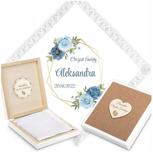 Staramy się szukać nowych pomysłów, tworzyć coś niepowtarzalnego. Zakładamy, że nasze upominki przeznaczone są na specjalne okazje, dla szczególnych osób. Cieszymy się zaufaniem wielu, często powracających klientów. PUDEŁKO + SZATKA przybliżony wymiar szatki - 26x26cm, nadruk termiczny, obszycie białą koronką bawełnianą, pudełko drewniane w kolorze białym z pamiątkowymi zdobieniami, wymiary pudełka - 145x165 zdobienie wewnątrz napisem "Pamiątka Chrztu świętego". Ważne informacje dla kupujących! Po zakupie, prosimy o podanie w informacji na adres empik0507@gmail.