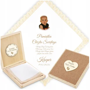 Staramy się szukać nowych pomysłów, tworzyć coś niepowtarzalnego. Zakładamy, że nasze upominki przeznaczone są na specjalne okazje, dla szczególnych osób. Cieszymy się zaufaniem wielu, często powracających klientów. PUDEŁKO + SZATKA przybliżony wymiar szatki - 26x26cm, nadruk termiczny, obszycie kremową koronką bawełnianą, pudełko drewniane z pamiątkowymi zdobieniami, wymiary pudełka - 145x165 zdobienie wewnątrz napisem "Pamiątka Chrztu świętego". Ważne informacje dla kupujących! Po zakupie, prosimy o podanie w informacji na adres empik0507@gmail.