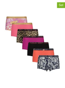 Majtki (7 par) w różnych kolorach W zestawie: - 7 par majtek w różnych kolorach i wzorach - pas / ściągacz: elastyczny - wycięcia nogawek: elastyczne - detale: przytwierdzone kokardki - wzór: mix
