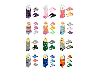 Piłka nożna, Awokado/Ananas, Banany, Zebra/Lew, Wiśnie/Kropki, Cytryny: 2 pary Kwiaty, Dinozaury/Palmy, Rekiny, Paski/Jednorożec/Tęcza, Wieloryby/Deska surfingowa, Buźka cytryny: 3 pary Materiał: Awokado/Ananas 36-40: 72% bawełna, 26% poliamid, 2% elastan 41-46: