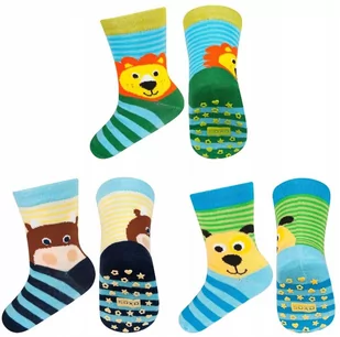 Zestaw kolorowych dziecięcych skarpetek z zabawnymi pyszczkami zwierzątek. Składa się z 3 par wesołych skarpetek w paski w żywych kolorach z przewagą niebieskiego i zielonego. Wzór skarpetek wzbudza sympatię i zachęca do noszenia. Spodobają się dzieciom, które lubią zwierzątka i kolorowe elementy garderoby. Skarpetki z zabawnymi postaciami zwierzątek sprawią, że ubieranie ich będzie czystą przyjemnością.