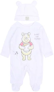 Jedna sztuka welurowych śpioszków, pajacyków na długi rękaw + czapeczka. Komplet w kremowym kolorze, z motywem Kubusia Puchatka. Długie nogawki z zakrytymi s...