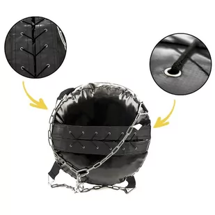 Sznurowane zamknięcie worka zapewnia doskonałą wytrzymałość na otwarcie/rozerwanie. Metalowe nity zabezpieczają materiał przed rozdarciem oraz posiadają gładkie krawędzie, by chronić przed przetarciem wiązania. Pod wiązaniem znajduje się dodatkowa zakładka materiału, która zapewnia prawidłową szczelność worka. Wielomateriałowe wypełnienie oraz mocne ubicie zapewniają użytkownikowi odpowiednią twardość i wagę. Materiał: Wykonanie z mocnego plawilu, łańcuchy zgrzewane i na stałe przyszyte do worka Wypełnienie:
