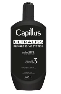 Balsam nawilżający ULTRALISS CAPILLUS 400ml - krok 3 kuracji CAPILLUS ULTRALISS Nanoplastia CAPILLUS ULTRALISS Nanoplastia to profesjonalna linia kosmetyków do progresywnego prostowania włosów bez formaldehydów z organicznym kwasem glioksalowym keratyną oraz kompleks aminokwasów. Skutecznie odbudowuje i nawilża włosy dzięki czemu zmniejsza objętość oraz puszenie się włosów pozostawiając wygładzone oraz lśniące włosy. Dla długotrwałego utrzymania się efektu prostych włosów zaleca się po zabiegu używać do pielęgnacji włosów kosmetyków bez soli i z keratyną. Ważne! Przed zabiegiem zaleca się wykonanie testu elastyczności włosów tak aby określić ich kondycję jest to istotne dla dobrania właściwej ilości serum prostującego Capillus Ultrallis. Nie należy wykonywać zabiegu nanoplastii na włosach zniszczonych o słabej kondycji.