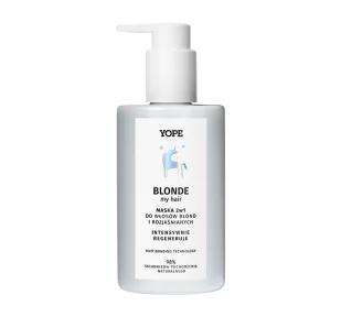 Odkryj tajemnicę maski do włosów blond i rozjaśnianych od Yope Blonde my Hair!Intensywnie regenerująca maska 2w1 to prawdziwa moc odżywienia w formie wygodnej odżywki. Co ją wyróżnia? To HAIR BONDIN TECHNOLOGY, innowacyjny kompleks naturalnych składników, który wzmacnia włosy i domyka ich łuski, spełniając wszystkie potrzeby Twoich włosów blond, rozjaśnianych i siwych. Co dokładnie potrafi maska Yope?Redukuje uszkodzenia powstałe po rozjaśnianiu, przywracając Twoim włosom dawny blask. Wzmacnia w
