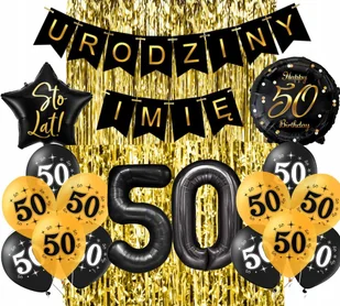 Zestaw urodzinowy W zestawie znajdują się: ✔️kurtyna złota 1x2m - 1szt ✔️girlanda urodziny + dowolne imię ✔️balony cyfry czarne 100cm tworzące napis 50 ✔️bal...