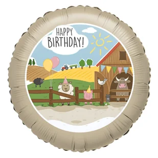 Okrągły balon foliowy o średnicy 17" = ok 43 cm. Balon przedstawia krajobraz wsi: zwierzęta gospodarskie, stodołę oraz pola które przemierza traktor z przycz...