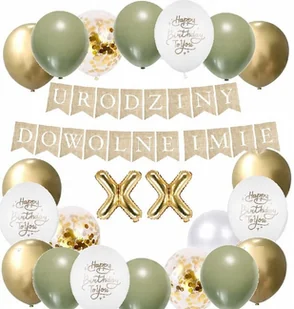 ZESTAW BALONÓW dowolne urodziny BANER URODZINY 100 cm + dowolne IMIĘ BALONY dowolne CYFRY złote- 35 cm do pompowanie wyłącznie powietrzem BALONY KHAKI -6 szt...