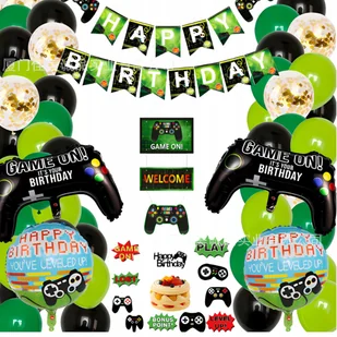 Balony Lateksowe Zestaw Gracz Pad Gamingowy Game Baner Urodziny Dekoracje ⭐1x baner happy birthday około 2m ⭐10x balon lateksowy jasny zielony ⭐10x balon lat...