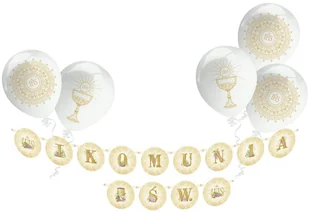 Bukiet pięciu balonów. Doskonały zestaw Złota girlanda z napisem, pięknie zdobiona 5 balonów z motywem komunijnym IHS Pierwsza komunia święta dziecka to wyją...