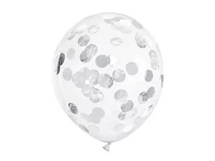 Balony przezroczyste ze srebrnym konfetti 6 sztuk lateksowych, transparentnych balonów wypełnionych foliowym konfetti w kształcie kółek. Kołeczka w kolorze srebrnym. Średnica konfetti 2,5 cm. Balony można napełniać również helem.