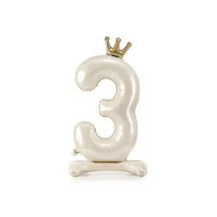 Stojący balon foliowy cyfra ''3'' w kolorze jasnokremowym z satynowym wykończeniem i koroną w kolorze złotym, rozmiar przed napompowaniem 103 cm (40.5''), rozmiar po napompowaniu 84 cm (33''). Do napompowania powietrzem. W zestawie dołączona jest słomka