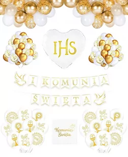 PIERWSZA KOMUNIA ZESTAW DEKORACJE BALONY KOMUNIJNE Zestaw komunijny składa się z: *balon serce 18" IHS-1szt *girlanda komunia święta-1szt *serwetki komunia święta-10szt *balony białe lateksowe ze złotym nadrukiem komunijnym-20szt *balony lateksowe białe-10szt *balony lateksowe złote-10szt *balony lateksowe ze złotym konfetti-10szt W naszej hurtowni jest możliwość dokupienia większej ilości serwetek ,balonów, a także balonów białych i złotych, idealnie pasujących do zestawu. Zamów zestaw balonów komunijnych w sklepie Towarnafestyny i zyskaj najwyższą jakość i najniższe ceny.