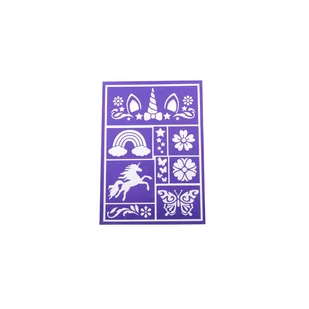 Szablon do makijażu dziecięcego motyle jednorożce Uroczy szablon do makijażu dziecięcego w pięknym fioletowym kolorze zawiera motywy takie jak jednorożec, tęcza, kwiaty i motyle. Wymiary 14x20 cm, idealny zarówno dla małych, jak i większych twarzy. Precyzyjne wycięcia pozwalają na szybkie i zabawne tworzenie różnorodnych wzorów. Doskonały dodatek do dziecięcych przyjęć, festynów czy urodzin. Pozwól maluchom wcielić się w magiczne postacie i stwórz urocze wspomnienia.