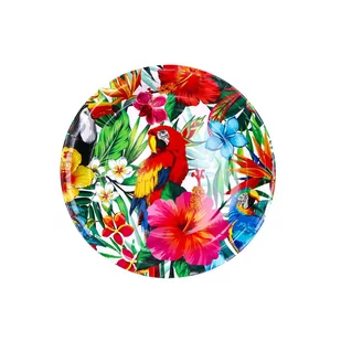 Dekoracyjne talerze papierowe idealne na imprezy tematyczne, które z pewnością przyciągną uwagę gości. Talerze o średnicy 23 cm są wykonane z papieru o wysokiej jakości, dzięki czemu są wytrzymałe i odporne na przetarcia. Ich piękny nadruk w kolorowe egzotyczne kwiaty oraz z czerwoną papugą na środku na pewno przypomni uczestnikom imprezy o tropikalnym klimacie. Talerze nie tylko pięknie się prezentują, ale również są bardzo praktyczne w użyciu. Są lekkie i łatwe do przenoszenia, a po użyciu można je łatwo wyrzucić.